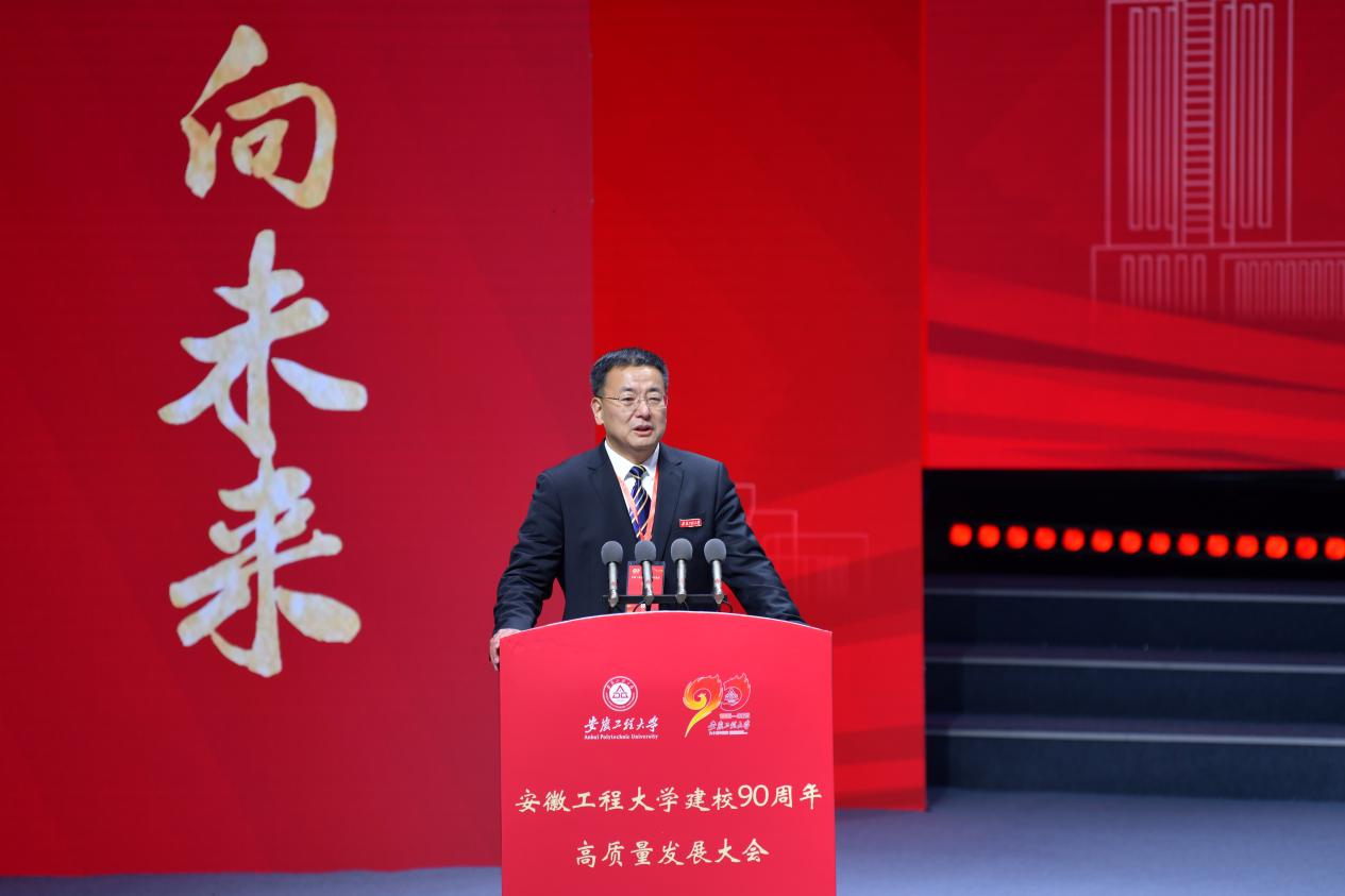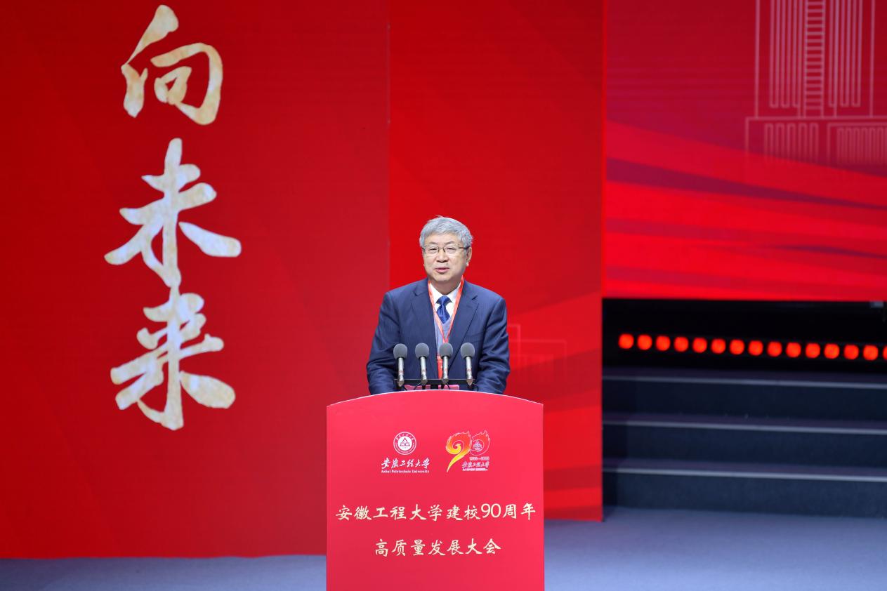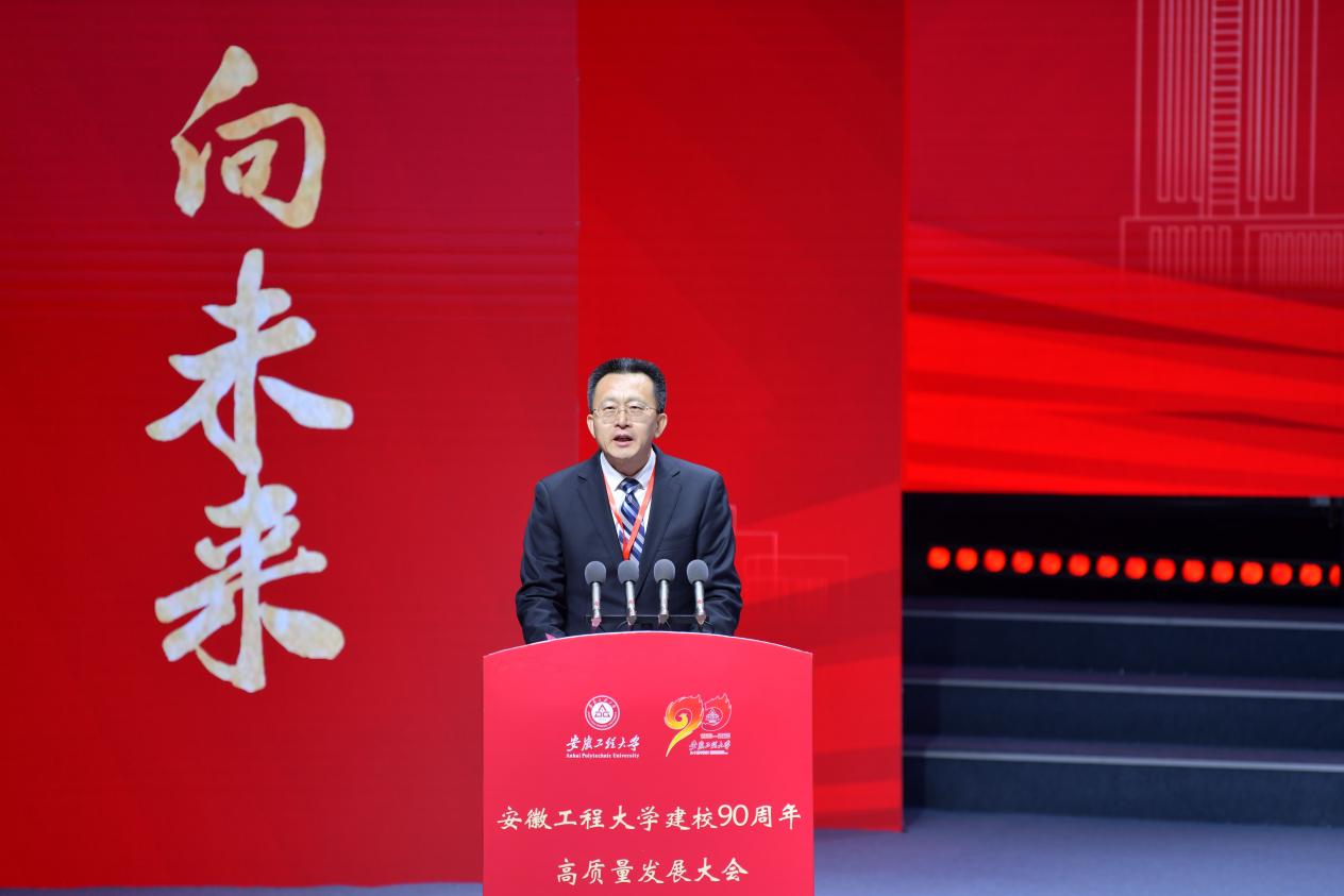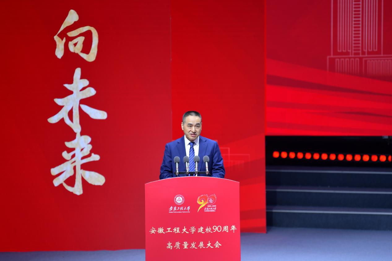于祥成代表省内兄弟高校致辞,并向安徽工程大学全体师生员工、海内外校友致以热烈祝贺与美好祝愿。他指出,安徽工程大学始终以“工业报国、教育兴国”为己任,累计培育二十万余名优秀人才,为区域经济社会发展及战略性新兴产业升级作出重要贡献。期待与安徽工程大学携手并肩,一体推进学科共建、平台共享、人才共育,为加快打造“三地一区”、推进中国式现代化赋能助力